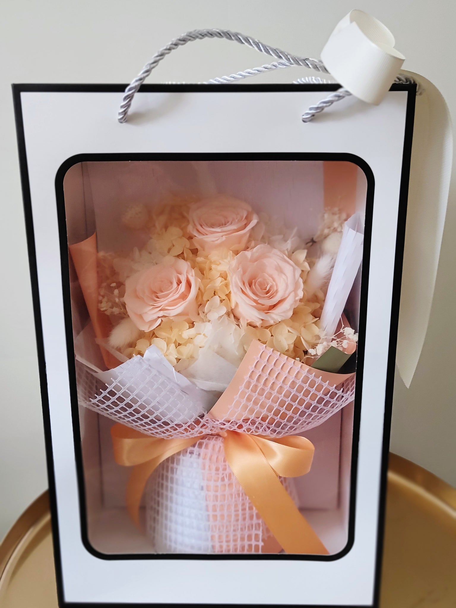Elegant and beautiful everlasting bouquet of dried or preserved flowers with Peach Roses, Hydrangea and other filler flowers in a beautiful Box Bag. The arrangement is mainly in blush, peach tones. This arrangement will definitely be your favourite forever. Perfect for any occasion. BOX size around 38 cm h x 25 cm w.